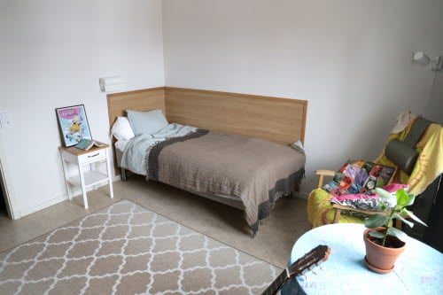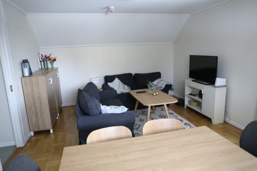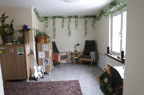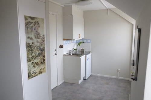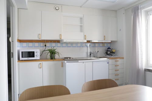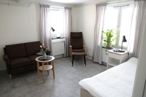 Minitvåa för en person, 34 m² (med möjlighet att hyras av två personer, priset per person blir då kostnad för måltider och halva hyran för lägenheten). Har vardagsrum och separat sovrum, nya tapeter och golv 2022, nya möbler inköpta 2023. De ligger i hus 06 och har egen toalett och dusch samt litet pentry med eget kylskåp, diskbänk finns, ej matlagningsmöjlighet. Huset har en trappuppgång, likt ett lågt hyreshus i två plan samt källare. I trappuppgången finns sex rum varav två har separat sovrum, övriga fyra rummen är vanliga stora rum, se ovan. Här finns gemensamt kök och sällskapsrum, med tvättstuga i källarplan.