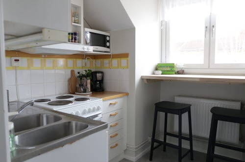 Tvårummare för två personer, 45 m² nyrenoverad 2023, nya möbler. Minimalt men fullt utrustat kök med barbord vid fönstret. Vardagsrum med parkettgolv, två soffor, sideboard/bokhyllor, matbord med fyra stolar samt fransk balkong. Sovrum med två 90 cm sängar och tre garderober. Egen toalett och dusch, två förråd. Ligger en trappa upp med egen ingång. Tvättstuga i porten bredvid.