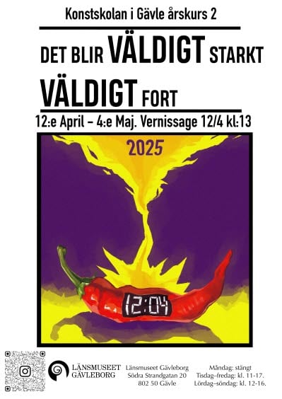 "Det blir väldigt starkt väldigt fort” är en slututställning av tvåorna på Konstskolan i Gävle. Under sina år på Konstskolan har de utforskat sina förmågor inom konsten och känslor som uppstår i samband med den och livet som pågår utanför. Både vardagen och konsten vittnar om att det kan bli väldigt starkt väldigt fort och i utställningen ser vi glimtar från denna process hos de elva deltagarnas konstnärskap.