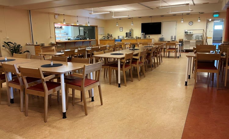 Det innebär bland annat att matsalen och köket har flyttat till vår ”nya” tillfälliga matsal i källaren på hus 11. Matsalen är nu i cafeterian utanför Baldursalen och köket har flyttat in i den tidigare cafeteriaserveringen. En del anpassningar har gjorts i utrymmet för att verksamheten ska kunna tillaga  och servera till exempel frukost, fika och sallad. Eleverna får sin lunch och middag via catering från sjukhusets restaurang.