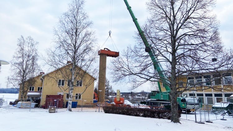 I veckan har den stora skorstenen intill hus 05 rivits med hjälp av en stor lyftkran och anpassad container. Skorstenen har funnits på skolan sedan den äldsta skolbyggnaden (hus 05) byggdes 1947.