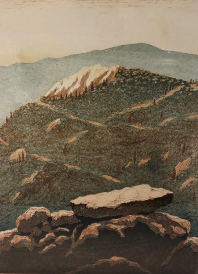 I Harry Mobergs träsnitt Landskap med stenar breder ett landskap ut sig där en bergvägg reser sig i bakgrunden medan tunga stenblock ligger utspridda i förgrunden, nästan som vilande kroppar. Bildens färger är dova, nästan dämpade, vilket ger ett intryck av stillhet – man kan nästan känna den varma, torra luften som doftar av damm och jord.