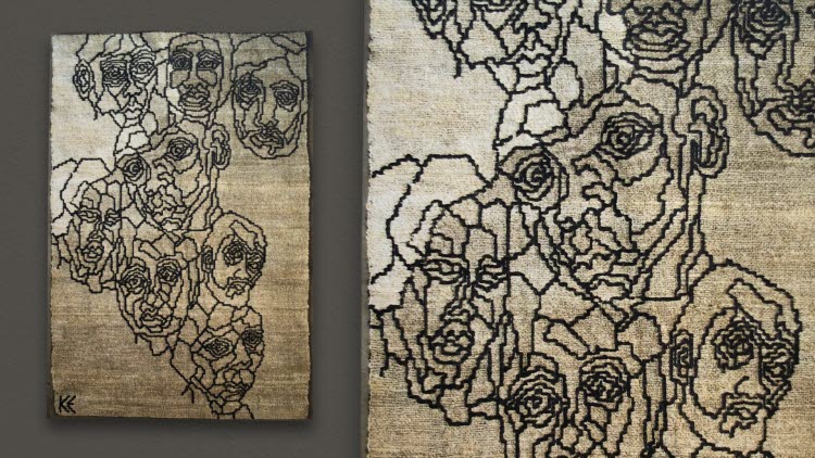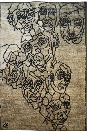 Det som formar ansiktena är linjer – upprepade, nästan oavbrutna, som om konstnären ritat dem utan att släppa pennan. Men här är det inte blyerts eller tusch, utan tråd. Som i en lek där väven sökt formen i ett enda svep. Resultatet är både lekfullt och precist – linjer som bär ansiktena fram, samtidigt som de drar ögat genom hela väven.