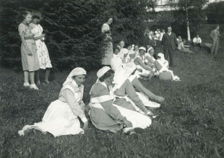 Midsommarfirande, sköterskor i parken. Bollnäs lasarett, 1940-tal.