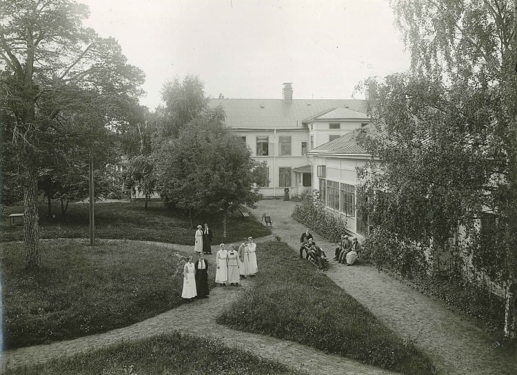 Gävle lasarett, sjuksköterskeelever i sjukhusparken 1912. Ingeborg Jonsson.