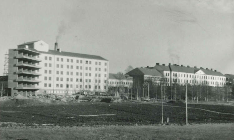 Månadens fotografi föreställer bygget av Bollnäs centralsanatorium vintern 1947. Maskinist Friberg har fotograferat den nyligen hissade taklagsflaggan och isoleringsarbetet på ligghallarnas tak pågår för fullt. Känner du till något mer om bilden? Står den gamla sanatoriebyggnaden kvar än idag? Vad används i så fall byggnaden till? Skriv gärna till Regionarkivet och berätta mer.