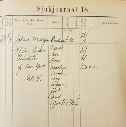 I patientrullan har man försvenskat John Madigans namn och man skriver att cirkusdirektör Johan själv har betalat sin sjukhusräkning på 4,80 innan han avled.
