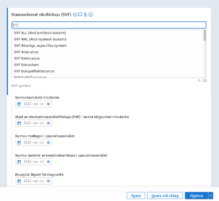 Vid genomförandet av satsningen på standardiserade vårdförlopp (SVF) ingår att på nationell nivå följa upp väntetiderna. Uppföljningen i Region Gävleborg ska omfatta mätpunkterna ”datum då beslut fattas om att välgrundad misstanke föreligger”, datum för ”första besök i specialiserad vård” samt ”datum för start av första behandling” eller annan orsak till avslut av SVF.