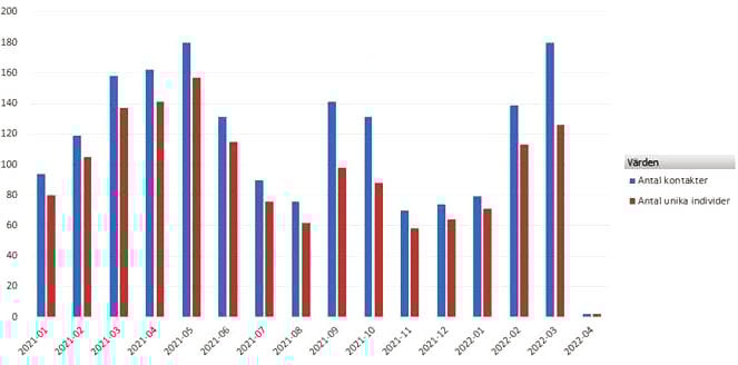 Diagrammet visar antal patienter med diagnosen postcovid och antal vårdkontakter.