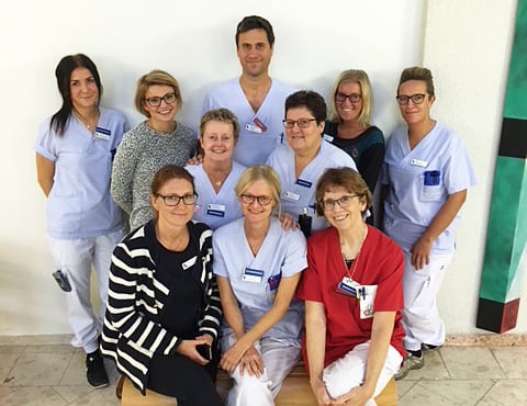 Övre raden fr v: Johanna Strandberg, sjuksköterska, Karin Fast, vårdenhetschef, Gabor Harsanyi, läkare, Kim Hald, chefsstöd, Maria Hägg, undersköterska. Mitten: Margareta Kjörling, barnmorska, Ann-Gerd Nilsson barnmorska. Nedre raden fr v: Maria Nilsson, chefstöd, Barbro Lindblom, sjuksköterska, Elisabeth Sjöström, barnmorska.