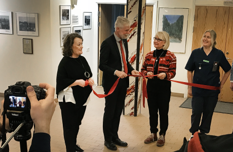Tommy Berger, hälso- och sjukvårdsnämndens ordförande (S) och Ann-Marie Rosvall, ordförande i Svågadalsnämnden, knöt tillsammans ihop ett invigningsband för Hälsorummet i Ängebo. Knuten är en symbol för samarbetet mellan Region Gävleborg och Hudiksvalls kommun. Till vänster Helena Bikoff, verksamhetschef för primärvården i Hudiksvall/Nordanstig och till höger Laila Persson, undersköterska i Hudiksvalls kommun.