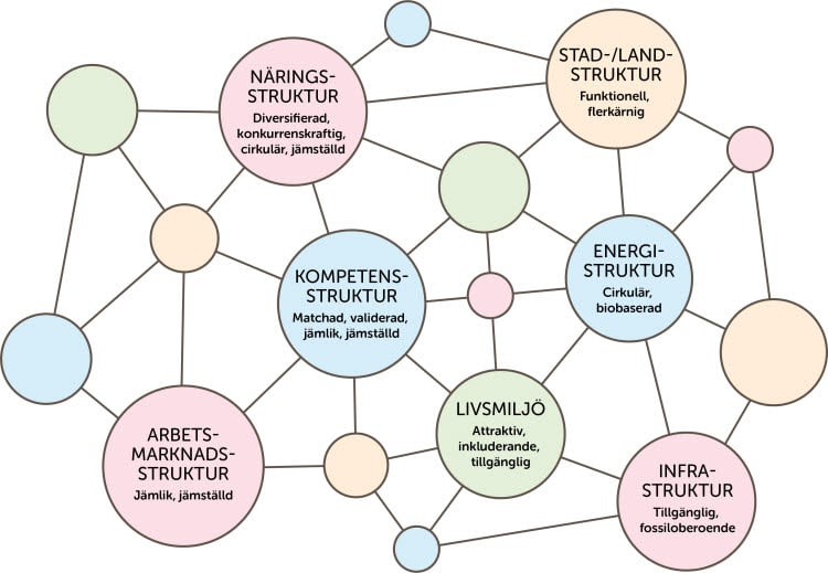 I RUS beskrivs vilka förändringar som behöver ske på sikt inom respektive struktur för att den ska bli mer hållbar. I nedanstående bild representerar varje ring en struktur med en beskrivning av den nödvändiga förändringen. Exempelvis behöver näringsstrukturen i vårt län bli mer diversifierad, konkurrenskraftig, cirkulär och jämställd. Bilden visar också att strukturerna hänger nära samman och påverkar varandra.